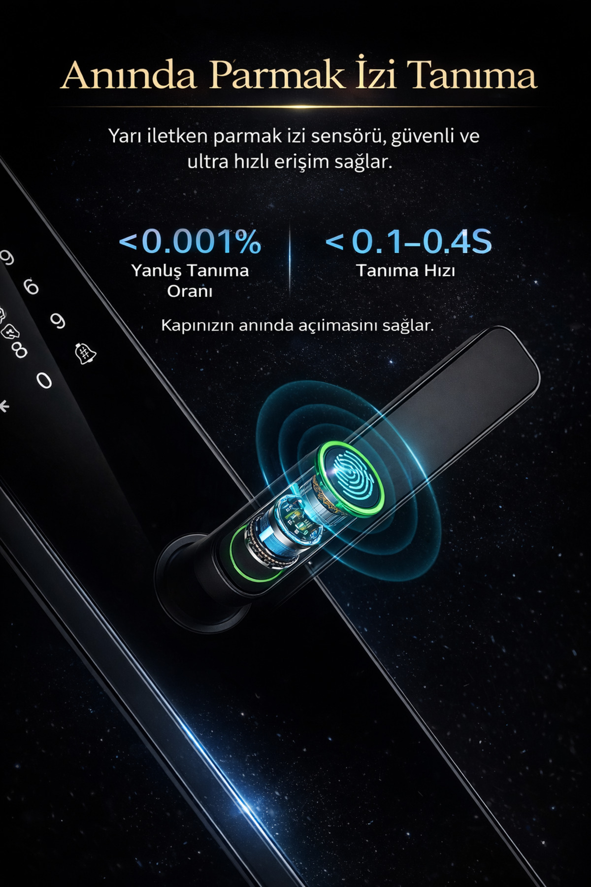 ⚡ 0,1 – 0,4 Saniyede Ultra Hızlı Tanıma Gelişmiş yarı iletken parmak izi sensörü sayesinde kapınız neredeyse anında açılır. Yanlış tanıma oranı <%0.001 seviyesindedir. Hızlı. Hassas. Güvenli. Çoklu Açma Yöntemi Parmak İzi Şifre IC Kart Manuel Anahtar Tuya Uygulama Desteği Her kullanıcı için esnek erişim seçeneği. Suya ve Dış Etkenlere Dayanıklı Tasarım Özel kaplama yüzeyi sayesinde yağmur ve nemli ortamlara karşı dayanıklıdır. Apartman girişleri ve dış kapılar için uygundur. Type-C Acil Güç Girişi Pil tamamen bitse bile Type-C bağlantı üzerinden geçici enerji vererek kapıyı açabilirsiniz. Kontrol her zaman sizde. Dayanıklı Malzeme Alüminyum alaşım gövde Çinko alaşım kol Uzun ömürlü iç mekanizma Hem estetik hem sağlam yapı. ‍‍‍ Aile Dostu Kullanım Şifreli IC kart özelliği, yaşlılar ve çocuklar için pratik ve güvenli erişim sağlar. Teknik Özellikler Sensör Tipi: Yarı İletken Parmak İzi Tanıma Hızı: 0,1 – 0,4 saniye Yanlış Tanıma Oranı: <%0.001 Güç Kaynağı: 4 x AAA Alkalin Pil Acil Güç: Type-C Montaj: Sağ / Sol uyumlu Kullanım Alanları ✔ Daire Kapıları ✔ Ofisler ✔ Airbnb / Kiralık Mülkler ✔ Villa Girişleri Larens NOVA X Pro, güvenliği teknolojiyle birleştirir. Sadece kapıyı değil, yaşam alanınızı da akıllandırır.